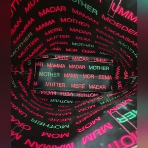 The bag's lining features a pattern composed of the word "MOTHER" in multiple languages, such as "MERE," "MADAR," "UMMI," "MUTTER," "MOEDER," "MAMAN," and "OKAASAN."