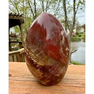 This Ocean Jasper freeform features layered bands in deep red, ochre, and muted cream tones, with a high polish that highlights its natural patterning. The piece is shaped into an oval standing form, with enough weight and balance to display upright without support.