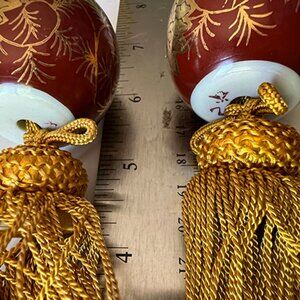 • DESCRIPTION: Large beads made of celadon porcelain in deep maroon with a gold-painted chrysanthemum pattern. Gold tassels are a twisted heavy thread that does not fray.