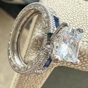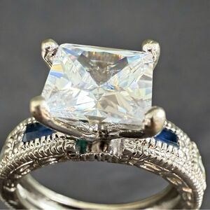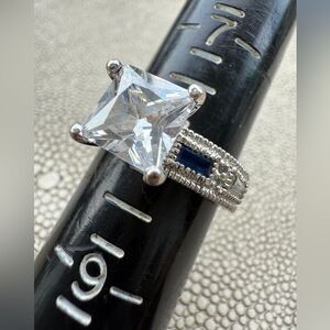 Large Princess Cut CZ Ring with Blue Accent Stones – Size 8 Bold Glam Look
