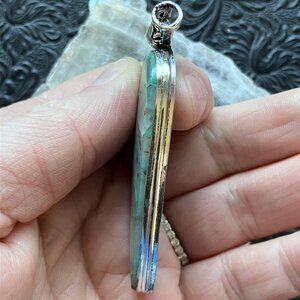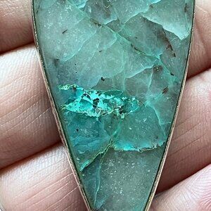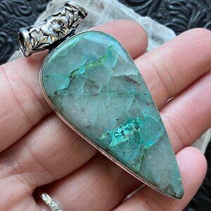 Pendant of a large quantum quattro chrysocolla stone crystal in a simple 925 silver frame with a floral bail.
