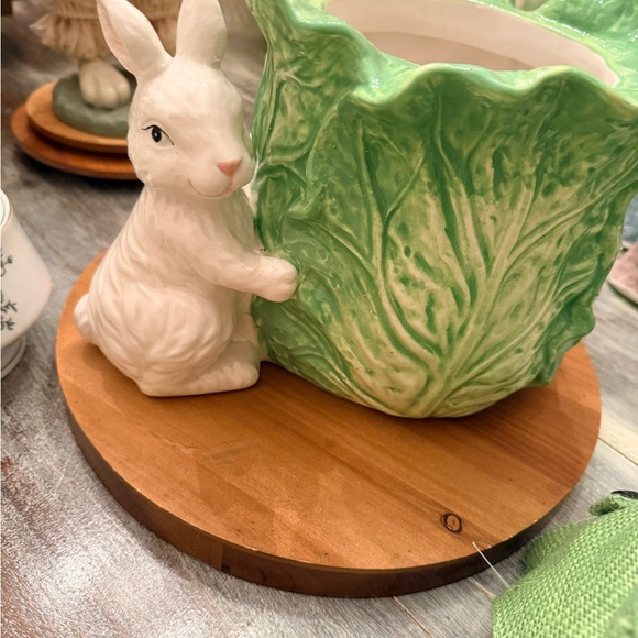 Charming ceramic planter featuring a white rabbit and green cabbage design. Perfect for adding a whimsical touch to your decor.
