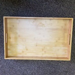 This is a large bamboo serving tray. It's big enough for breakfast in bed or to place on an ottoman while watching Netflix. There are no blemishes, flaws, or damage. It measures approximately 24" wide, 15" deep, and 2.75" tall.