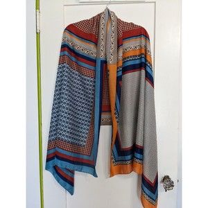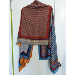 Large Rectangular Soft, Flowy, Silky Scarf, Wrap. Multicolor, Multi Print Geometric Color Block. Polka Dots, Paisley, Stripes. Blue, Rust, Orange, Cream, Tan. 35"X72". Semi-Sheer.