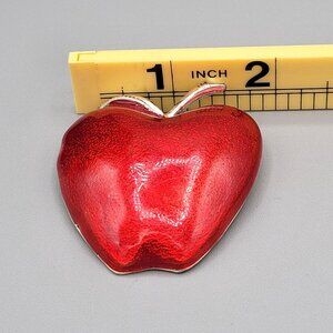 This vintage brooch features a large red enamel apple with silver tone leaves, perfect for adding a touch of charm to any outfit. Ideal for gift giving or collecting.