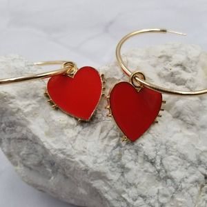 Large Red Enamel Heart Charm Gold Hoop Earrings