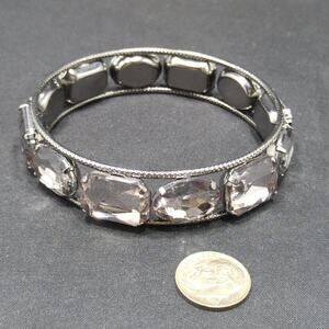 This is a great large rhinestone, prong set bangle bracelet with clear rhinestones that have a hint of lavender. The bracelet is 8 inches around the inside length, 5/8 Inches in width, and 2 3/4 Inches across the circumference. The metal finish is dark silver. It would be a great bangle bracelet for your collection.