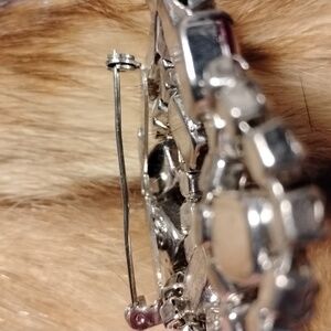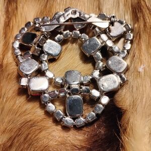 Listed is a large red and clear rhinestone brooch. Red rectangle stones combined with clear ones. Not signed. Really stands out! Selling as is in its original vintage state. Great for a collection.