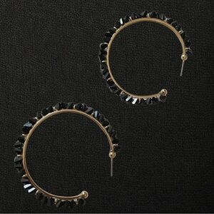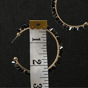 Stunning, statement style large hoop earrings. Gold tone metal with onyx black gemstones secured around the outer edges. Standard stud closure. Each earring weighs approx. 0.25oz and hang approx. 2.25"