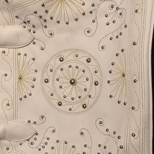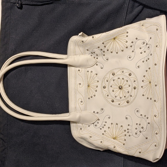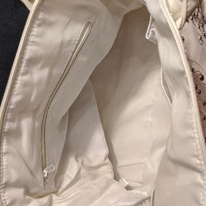 Large Rhinestone Tote. Rhinestone beads, zipper closure, very large inside compartment with zipper pocket and 3 slip in compartments. Small blemish on handle as shown. A74