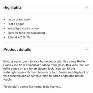 Brand new and sold out in stores, this Large Ruffle Glass Vase from Threshold is a statement décor piece that adds texture and elegance to any space. Crafted from glass with softly ruffled edges, this vase brings a modern organic, McGee-inspired look to shelves, consoles, mantels, or tabletops.