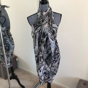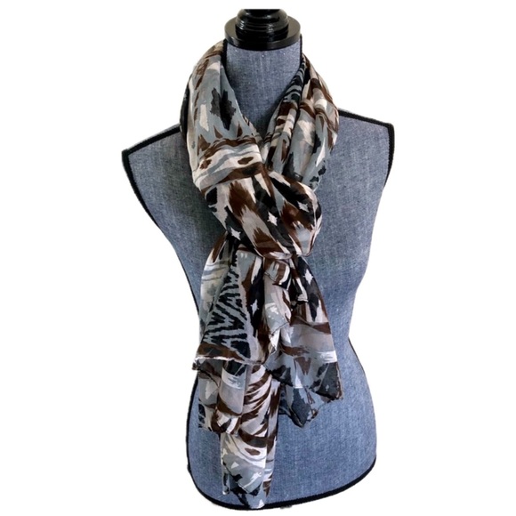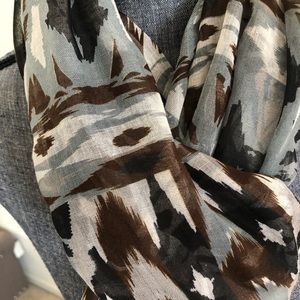 Large Scarf. Approx 75”x 35”. Colors of Dusty blue/white/black and brown. Excellent condition with no signs of wear.
