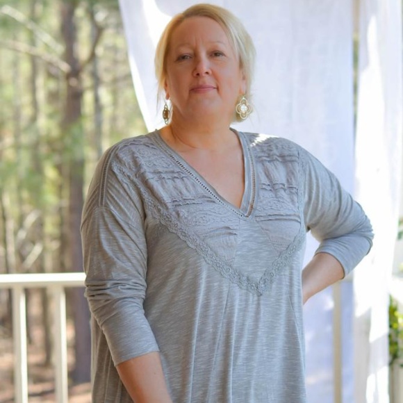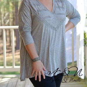 DERRINGER - Perfect go-to casual chic top in a neutral gray color. It has an oversize boho cut so it will swing around you and drape really nicely. It has a v-neckline accented with lace on the front. The back has a gathered pleat at the top to give the back a nice drape as well. The sleeves can be pushed up or worn long. This top can be styled casual chic or western chic depending on what you wear with it.