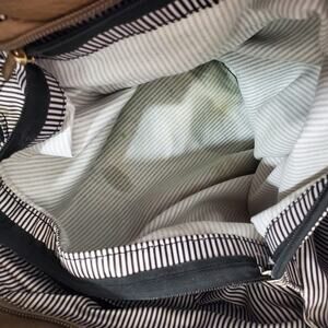 Inside of the big center interior zipper pocket, there is staining from a leaking beauty product. The strap's edge is coming off. See all pics for condition.