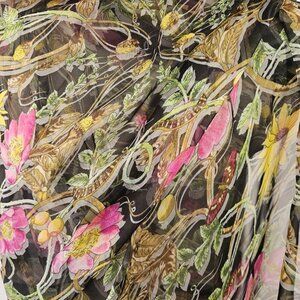 Large Silk Blend Rectangular Scarf Sheer Pink Yellow Floral on Black 42 X 76