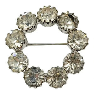 Vintage Large Silver Toned Clear Rhinestone Wreath Circle Brooch 1.5" x 1.5" One semi dead stone