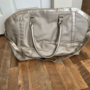 This elegant silver tote is perfect for any occasion. Its sleek design and neutral color make it a versatile addition to your wardrobe. In overall great condition- see photos for measurements
