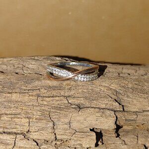 This elegant sterling silver ring, adorned with a rose gold accent and a delicate array of diamond-like stones, offers a timeless charm reminiscent of vintage heirlooms. The infinity design captures the essence of eternal love and connection, making it a cherished piece for generations.