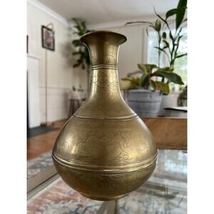 Large Solid Brass Vintage Etched, Vase, Home Decor, Sea Shell, Yin-Yang, Indian