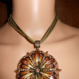For sale is a gorgeous large sparkly enamel flower pendant in earth tones.
