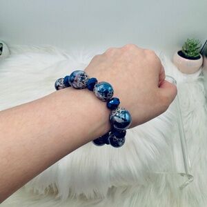 Material of the beaded bracelet can include: natural stone, glass beads, plastic spacer, rhinestone stopper