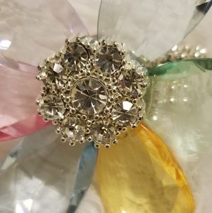 Multi colored blossom ring with clear center stones. Has an elastic stretch band.