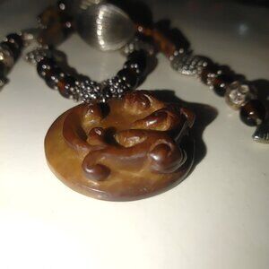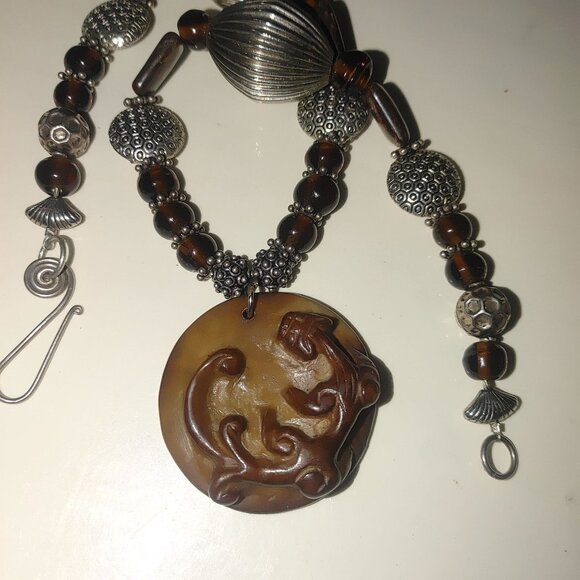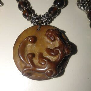 A timeless necklace showcasing a vintage-inspired carved brown pendant with an floral or animal motif. Accented with silver beads and warm brown tones, it exudes antique charm.