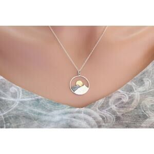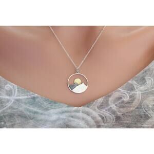 This is a beautiful Sterling Silver Mountain Sunset with Bronze Sun Necklace. Both the charm and the necklace are Sterling Silver (with exception to the Bronze Sun).