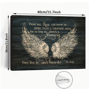 This large stretch canvas print features angel wings in a black color, perfect for honoring and remembering loved ones. Measuring 12 inches in height and 16 inches in length, this rectangular sign is designed for wall mounting in any room of the house, but it would also look nice displayed on an easel. The decorative style and material of wood make it a beautiful and meaningful addition to home décor. The message "Those We Love Can Never Be Far Away" brings comfort and reassurance to any space. A wonder gift for your person who has lost a loved one.