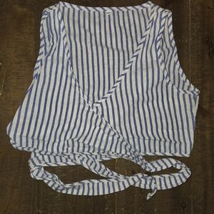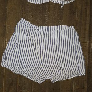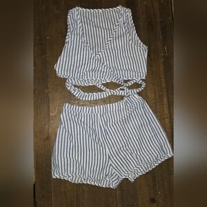 Trendy two-piece set with blue and white stripes. Includes a wrap top and matching shorts.