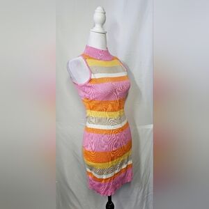 Color: Multicolor horizontal stripes in pink, orange, yellow, beige, and white