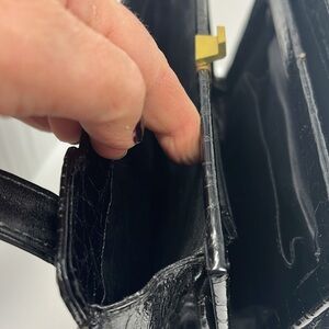 This is a gorgeous vintage Large Structured Crocodile Shoulder Hand Bag. In perfect condition. No cracks. No stains. No tears. No odors. Front and back full size compartment are both leather lined. Central snap closure compartment with leather interior and a slip in wall pocket and a zipper pocket. Genuine Crocodile Authenticity shank. 9”H x 10”W x 4”D with 6.5” double strap drops. Four goldtone feet at the bottom to protect the bag.