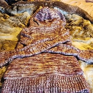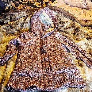 large burgundy crochet jacket/sweater. In good condition, buttons are missing on the arm cuffs. I just rolled the cuffs and it worked great.