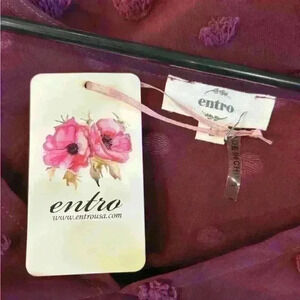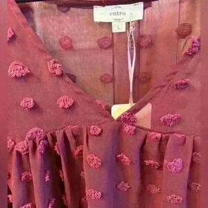 Entro brand Swiss dot maroon v neck shirt with bubble sleeves. Looks great with jeans or slacks. New with tags.