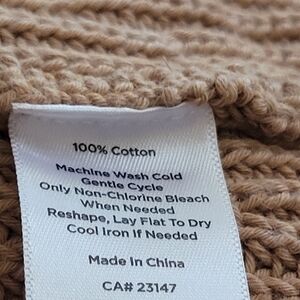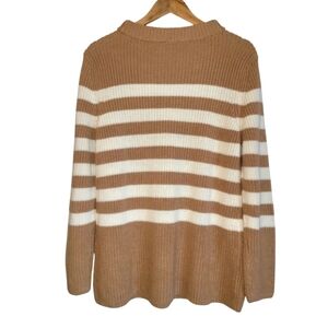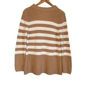 Large Talbots 100% Cotton Gently Worn EUC Like New Pretty & Thick Tan with Cream Stripes Long Sleeve Sweater. It features a mock neck and ribbed knit texture, with wide horizontal stripes in cream and tan. The cuffs and hem are also ribbed, contributing to the sweater's overall structure. Classic and comfortable women's sweater. The sweater's fit appears to be a relaxed or loose style, and it is likely designed to hit at or below the waist. Pair with a camisole of a similar color to prevent see-through issues.