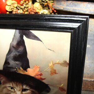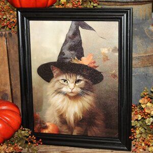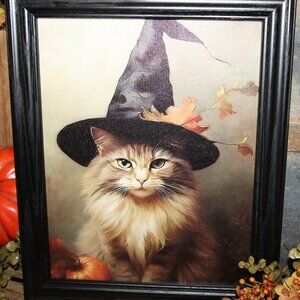 NEW 16.5" tall x 13.5" brown tabby cat in witch's hat framed wall decor picture art. Bold canvas print in rustic black wood ad glass front frame. Hanging hardware at rear. Perfect piece for Halloween 2025!