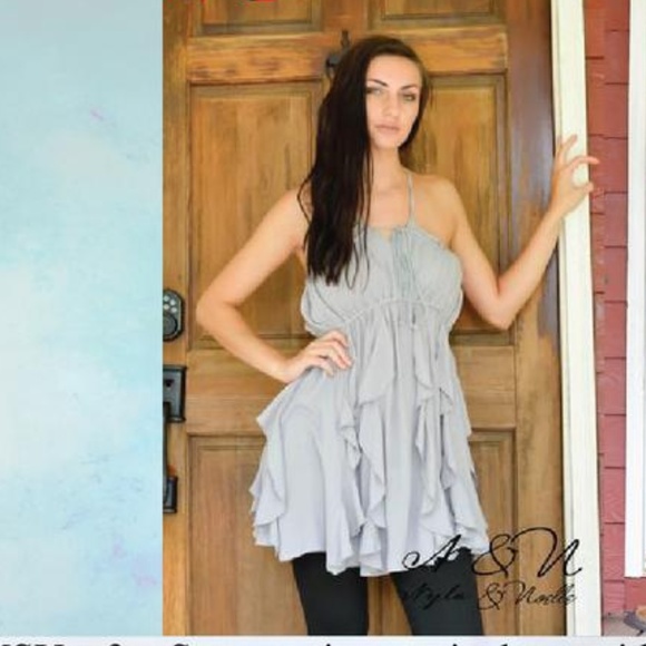 WHIMSEY - Cloud Color - a fun summertime tunic dress with a gathered bust and ruffle skirt in a bright and flirty soft gray color.