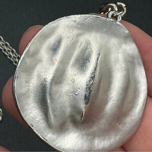 Circular pendant necklace in silver tone on a chunky graduated chain that gives brutalist, modernism artsy vibes