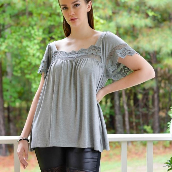 LARIMAR - Wow this top has it all. The lace trimmed neckline and sleeves are just darling and the boxy cut neckline is eye catching. But the best part is the lovely drape of the stretchy and super soft gray material.