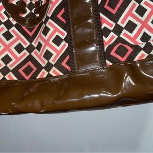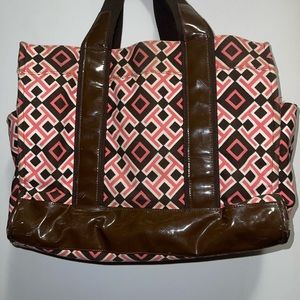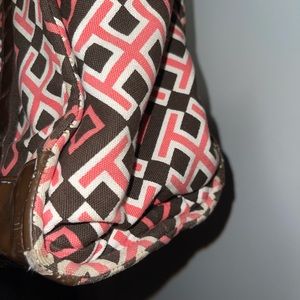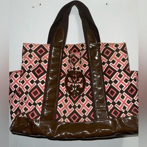 Great for a beach bag, diaper bag, or weekend bag, has two side pockets and a pocket inside that zips Tory logo on zipper, scuffs on sides as well on brown parts of bag but overall really cute tote please see pictures before purchase!