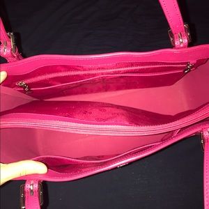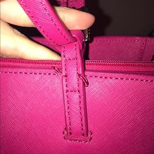 Large Tory Burch York Tote in pink. Has a fray on the handle shown in pictures. It was this way when I received it in the mail. Ordered from Tory Burch website. Only carried once. Other than the tiny fray it is in perfect condition