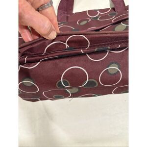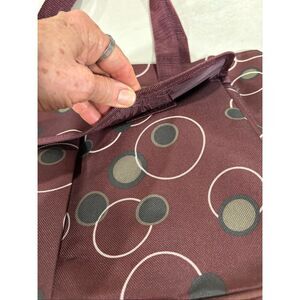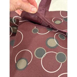 Large Tote Bag, New without Tags, Vinyl Lined, Pockets. Brown with black, cream, and green circles. This is a new fabric tote with woven straps and vinyl lining. Two outside pockets closed with Velcro. Two end pockets with mesh. Inside the handles are reinforced with extra fabric and stitching. Vinyl Lined. Square bottom, sits flat. Handle Drop: 7”. Length: 19”, Width:6”, Depth: 11”.
