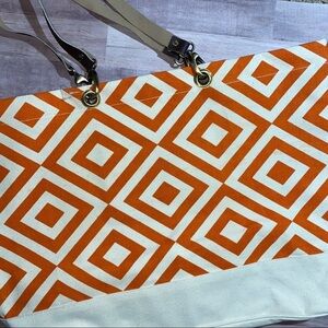Large tote with a brown handle. Orange & cream design. Has a canvas like feel. New without tags!
