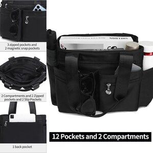 Tote Bag with Multi Pockets Inner: 2 main compartments, 2 inner pockets and 2 zipped pockets for important items, such as: wallets, credit cards and money; Outer: 3 zipped pockets and 2 magnetic snap pockets in the front for easy access to frequently used items, such as power bank, pens and sunglasses; 2 side pockets for water bottle and umbrella, 1 back zipper compartment. Allowing you to keep everything in its place, no more endless searching for keys or phone.