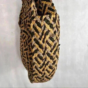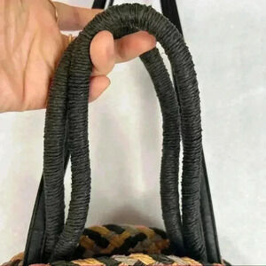 This large tote is a perfect addition to your collection. With a circular pattern and round shape, this handbag features snap closure and double handles made of leather. The exterior is made of jute and straw, while the lining is multicolor. The tote has inner pockets and is designed for unisex adults, with a bohemian, beachy, hippie, and retro style. It's perfect for outdoor activities and comes with shoulder straps. The handle/strap color is black, and the material is jute and straw.