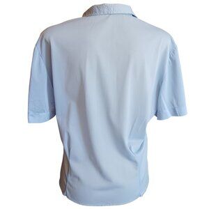 This vintage blouse exudes timeless elegance with its delicate pleated front, textured collar, and luminous white buttons. Its airy short sleeves and light blue hue make it an ideal choice for adding a touch of sophistication to your wardrobe.