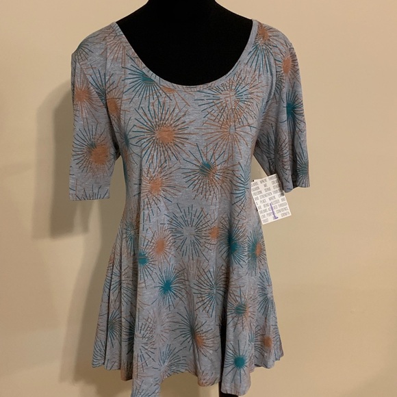 Size Large LuLaRoe Perfect Tee Slits on each side Gray with blue and orange fireworks