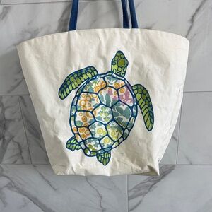 Stylish canvas tote bag featuring a vibrant turtle print. Perfect for everyday use with its durable design. The cream background and blue handles add a touch of elegance.