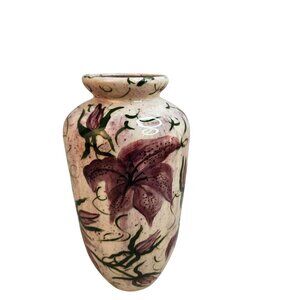 This hand-painted ceramic vase features intricate floral designs in a soft palette. Ideal as a decorative accent or functional piece for indoor spaces.