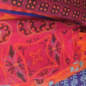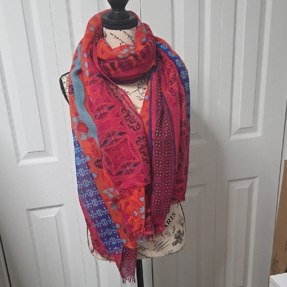 Bright and colorful scarf with intricate patterns in shades of blue, pink, orange and black. Semi sheer fabric in a ginormous 78" X 41" with small fringe on ends. In excellent pre-owned condition with no rips, stains or flaws. From my pet friendly non-smoking home to yours.